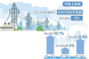 國家能源局近日發(fā)布數(shù)據(jù)顯示,今年上半年全社會用電量累計43076億千瓦時,同比增長5%,比去年上半年2.9%的增速提升2.1個百分點。與此同時,服務(wù)業(yè)、高端制造業(yè)等用電量增長較快,表現(xiàn)亮眼。用電量數(shù)據(jù)折射出我國經(jīng)濟復(fù)蘇態(tài)勢向好,經(jīng)濟發(fā)展結(jié)構(gòu)更優(yōu)。